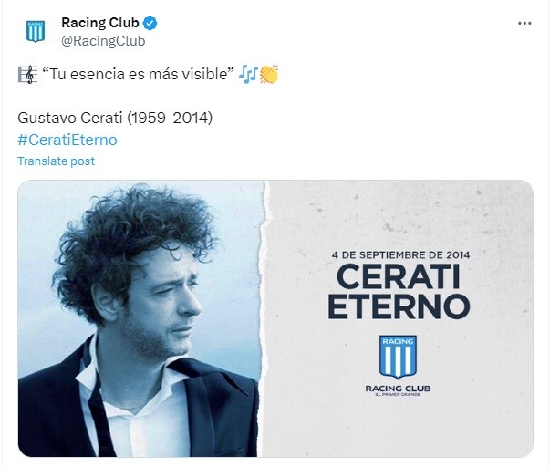 Incluso, el día de su fallecimiento y posteriormente en sus cumpleaños o aniversarios luctuosos, Racing suele recordarlo con mensajes en sus redes sociales
